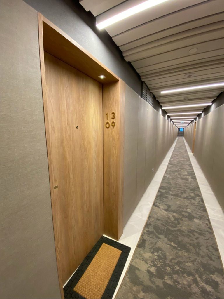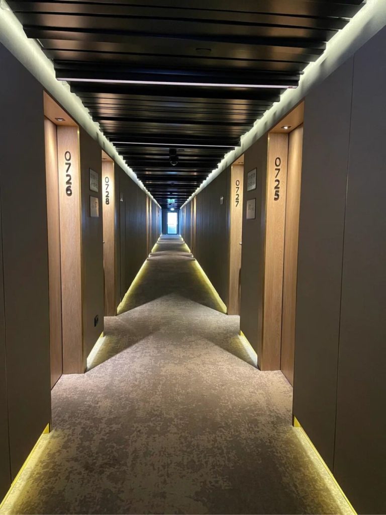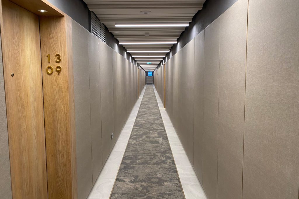 Для данного объекта была разработана система скрытия бытовых комнат, пожарных расчетов и прочих коммуникаций. Отделка велась на всех этажах комплекса, при этом работа самой гостиницы не останавливалась. Срок отделки всех коридоров составил 7 дней.